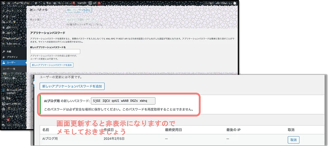 STEP1:Wordpressでアプリケーションパスワードを発行